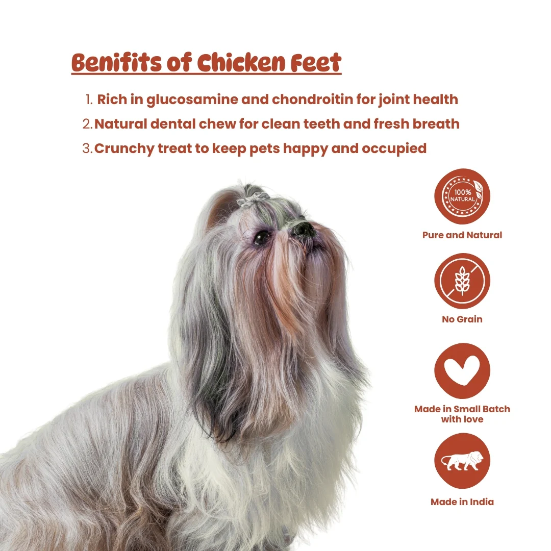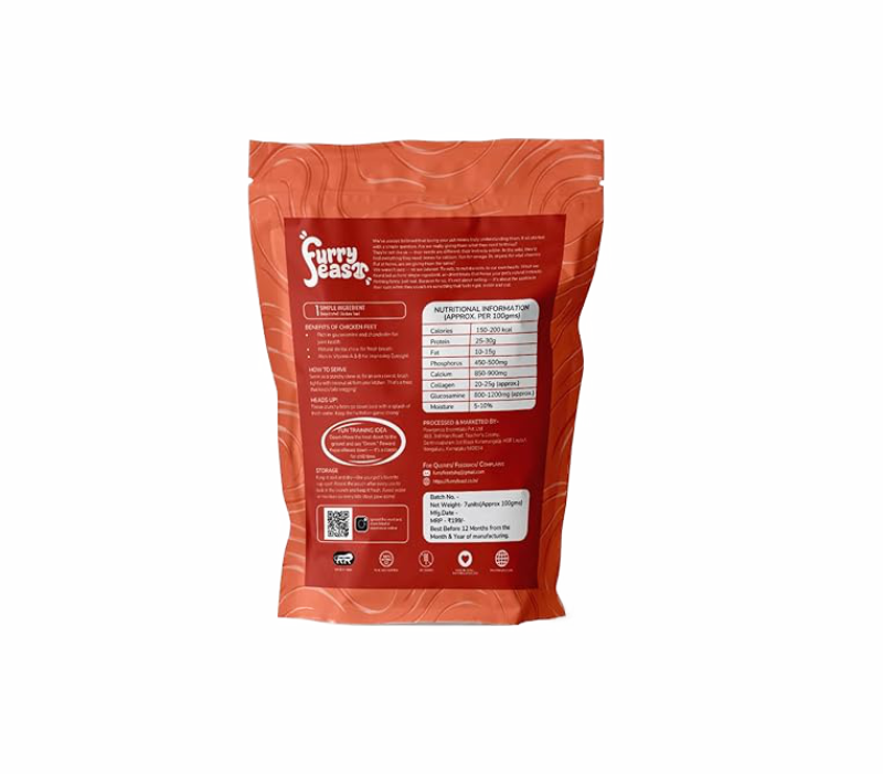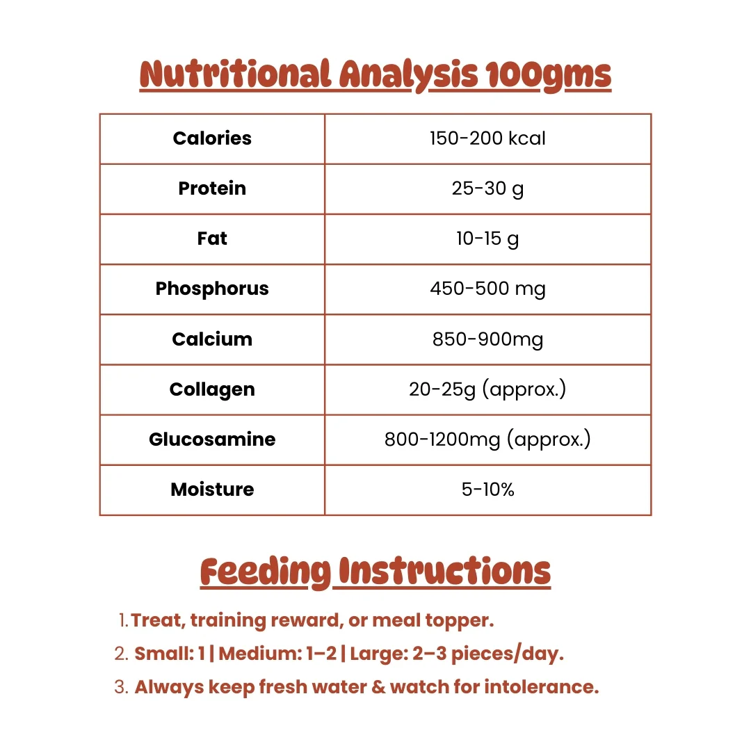 Yes, they look quirky. But pets go crazy for the crunch, and the bonus? Natural calcium and cartilage for healthy joints and teeth. Why Pet Parents Love It 🦴 Joint Support → Collagen + cartilage for mobility 🪥 Dental Care → Natural tooth scrubber 🐔 Pure & Simple → No fillers, just feet 🔥 Satisfying Crunch → Keeps pets engaged longer Serving Guide Perfect daily chew for bone & dental health. For Pet Parents Who: ✔ Want joint-friendly snacks ✔ Believe in rawhide-free chewing ✔ Don’t shy away from the “real stuff”